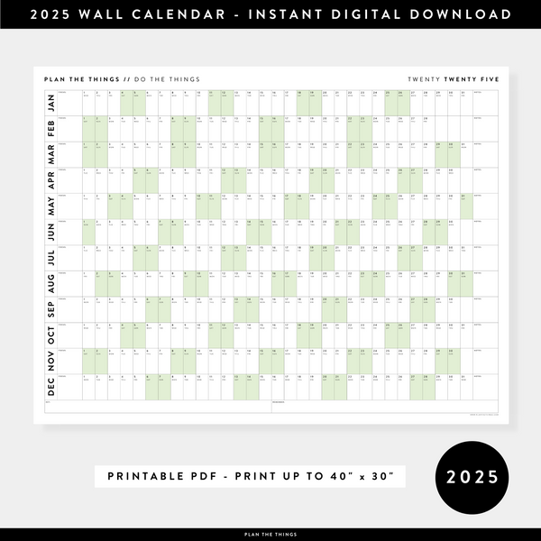 PRINTABLE 2025 HORIZONTAL WALL CALENDAR WITH GREEN WEEKENDS